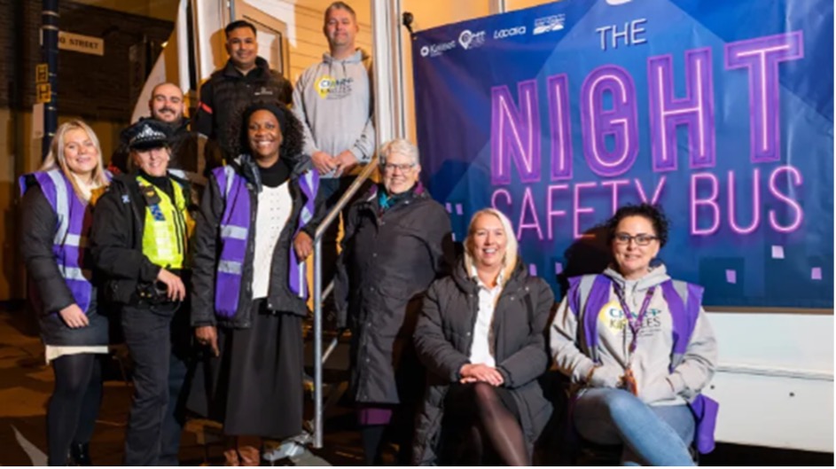 The “Safety at Night Bus” in Kirklees, launched in September 2022. This initiative, run by Change Grow Live in partnership with Locala, Safer Kirklees, and West Yorkshire Police, provides a safe space in Huddersfield Town Centre on Wednesday and Saturday nights. It primarily supports women and vulnerable individuals during nights out.